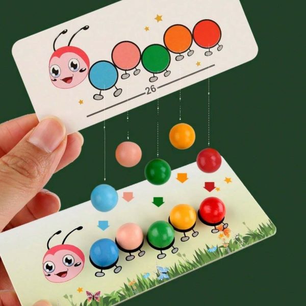 Deze set bestaat uit talloze houten kralen die kunnen worden gerangschikt om een levendige rups te bouwen.