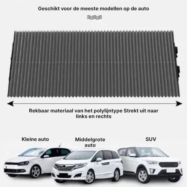 Deze zonnescherm is ontworpen om te passen op een breed scala aan voertuigen, waaronder auto’s, bestelwagens, vrachtwagens en SUV’s. Het is een universele pasvorm omdat je eenvoudig de breedte kunt aanpassen aan de gewenste maat.