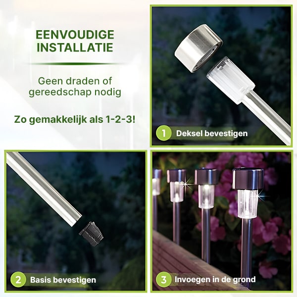Ervaar een probleemloze installatie zonder bedrading; steek ze eenvoudig in de grond en geniet van directe verlichting.